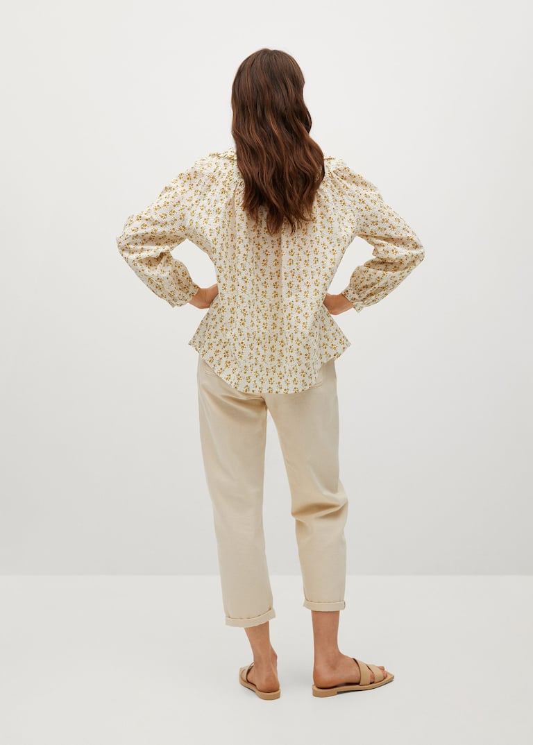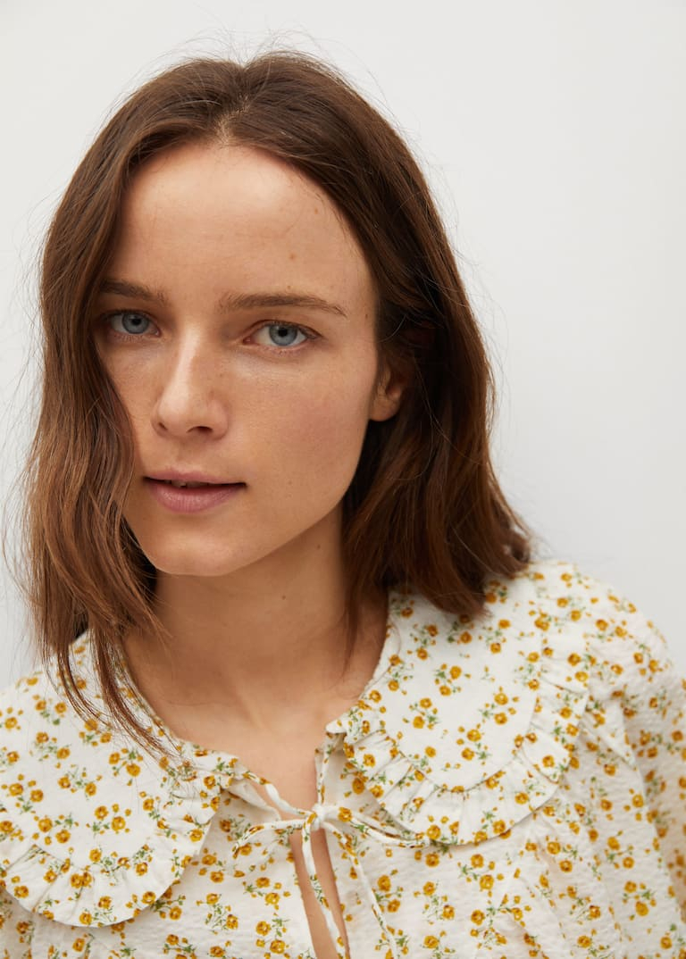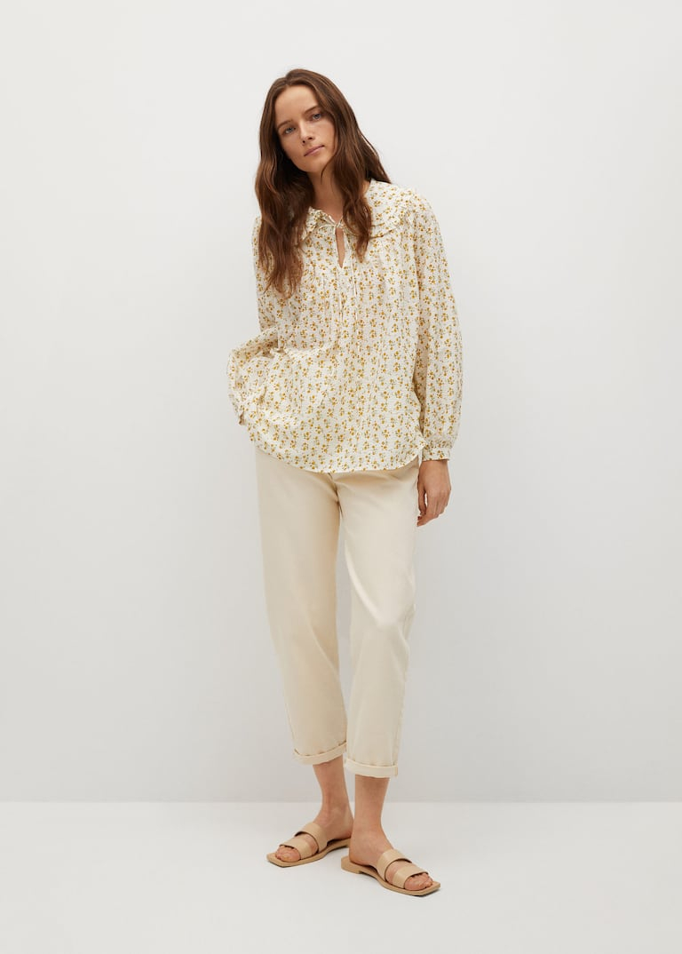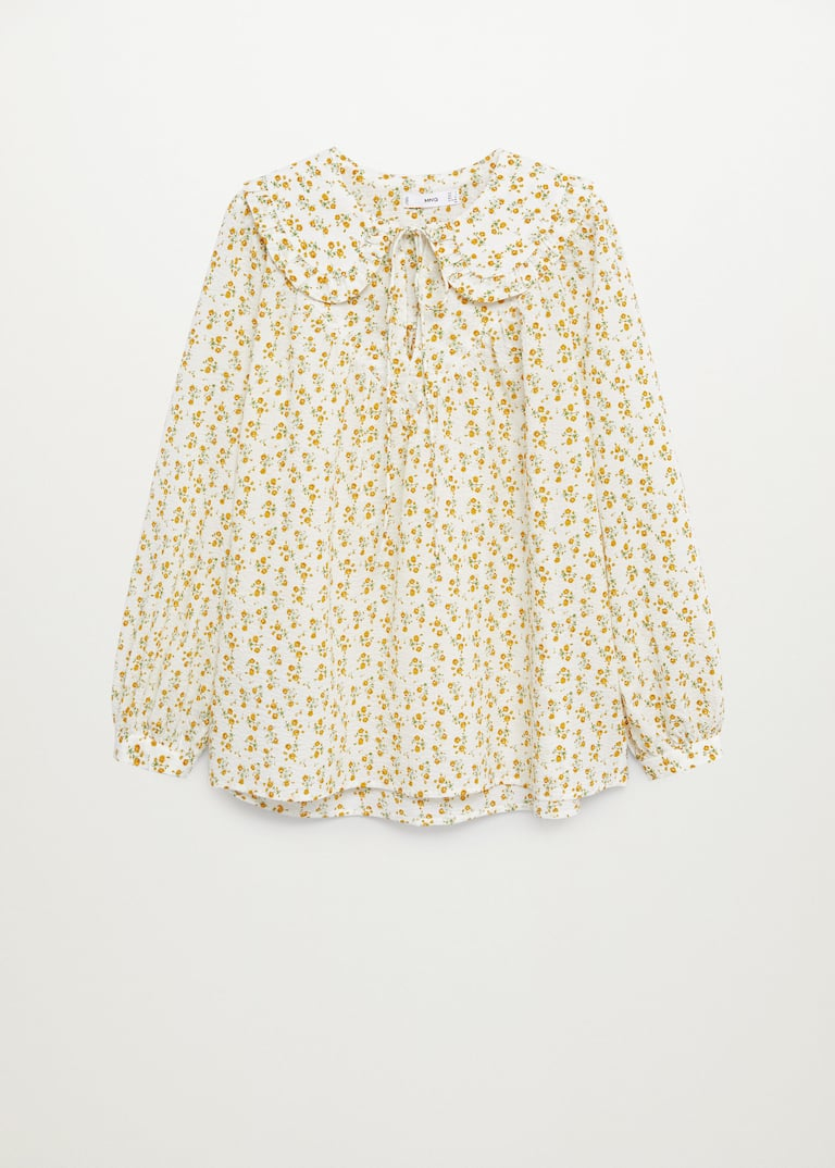 Bluză cu guler babydoll din bumbac 100%. Țesătură imprimată, guler babydoll, închidere la guler cu un șnur, mânecă lungă bufantă.