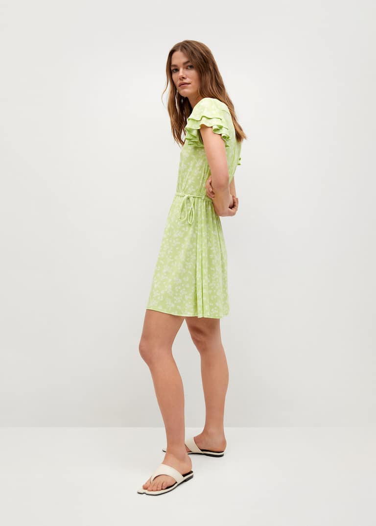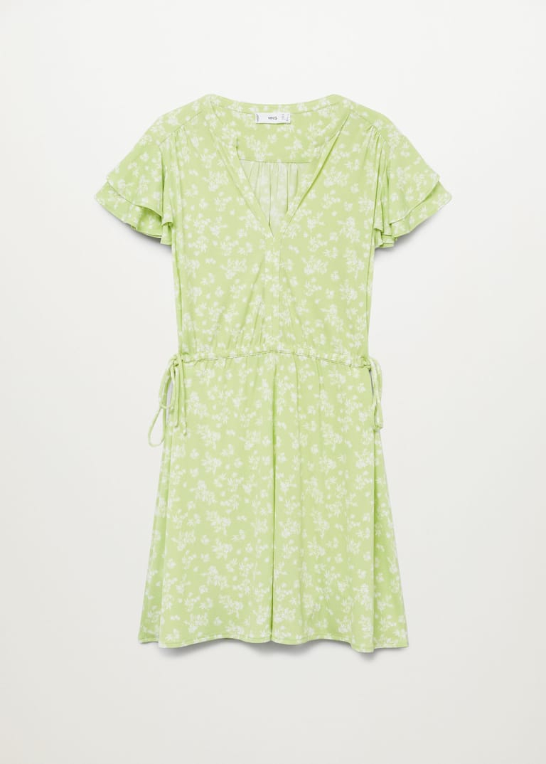 Rochie vaporoasă, model imprimat. Model scurt, drept. Guler în V, mânecă scurta cu volan. În talie este prezintă un cordon interior reglabil.