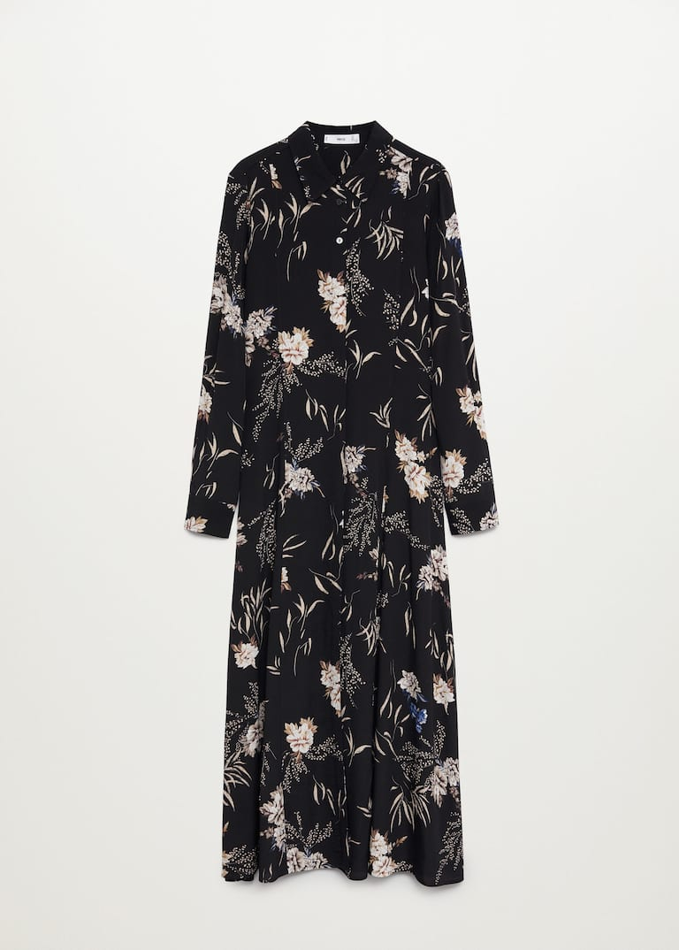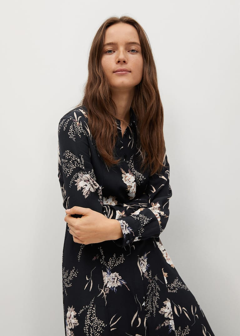 Rochie midi, model evazat cu imprimeu, material subțire, guler cu rever. Mânecă lungă, închidere în față cu nasturi.