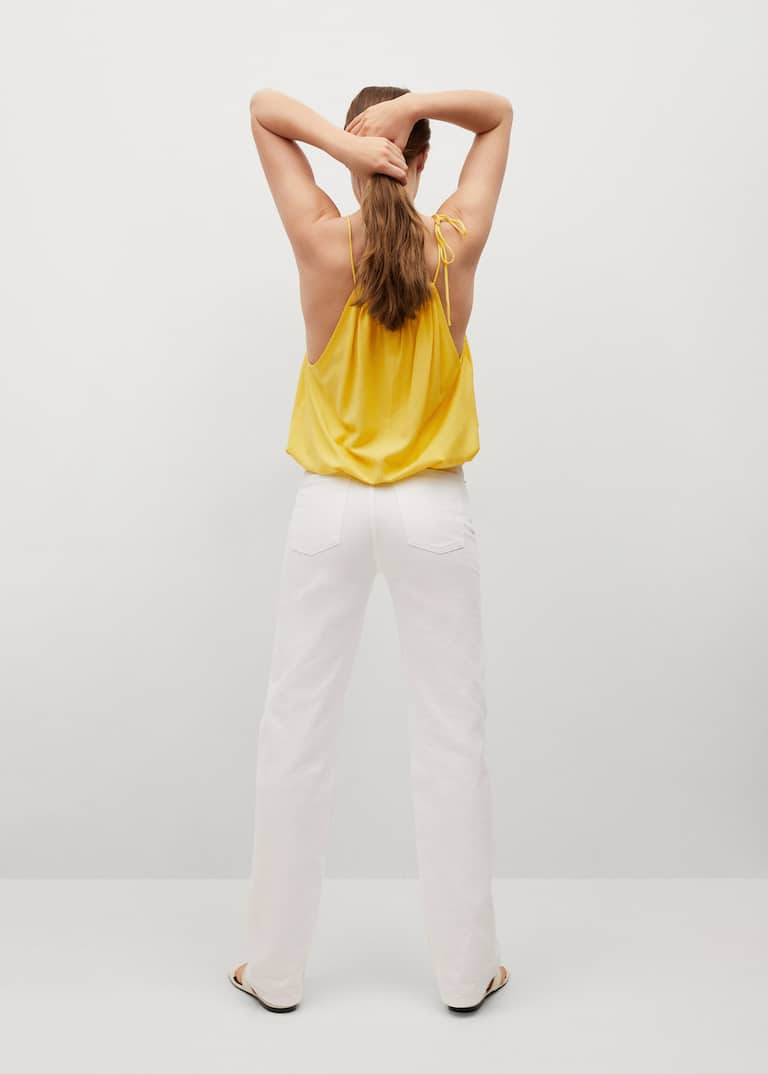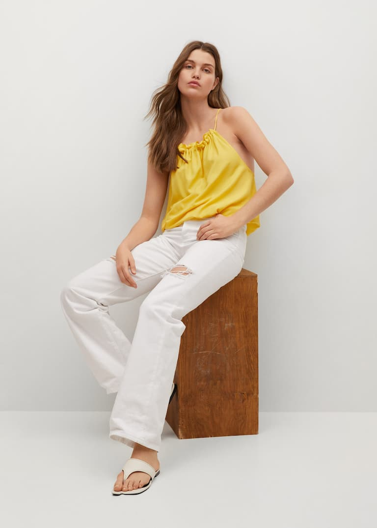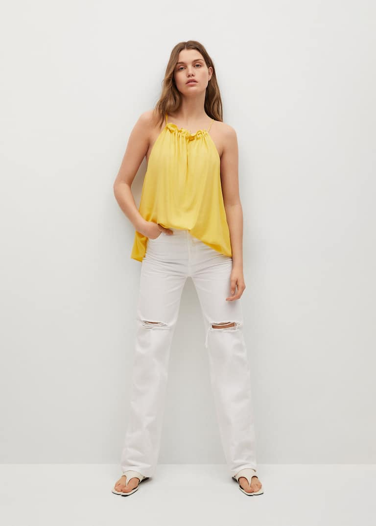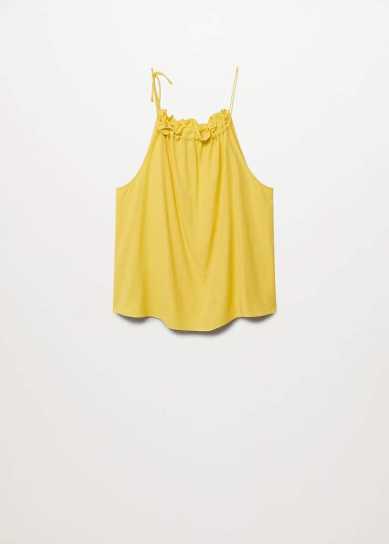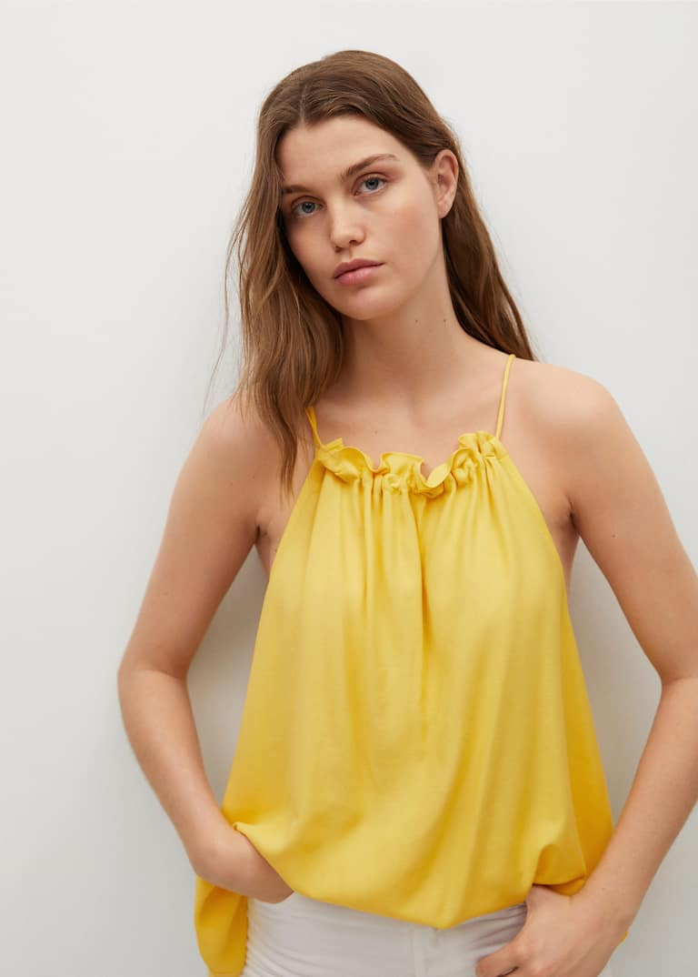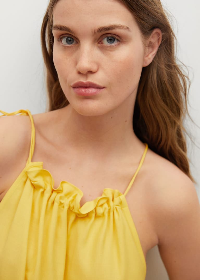 Top halter fluid, țesătură vaporoasă, guler rotund,  cu spatele gol, bretele subțiri reglabile, volane la guler