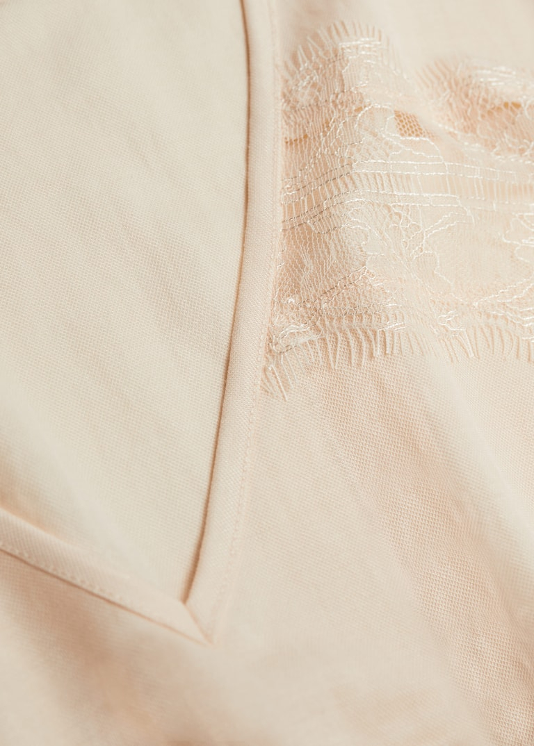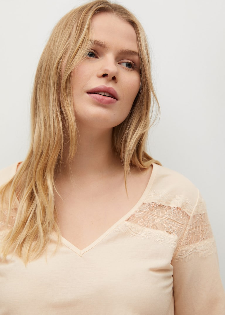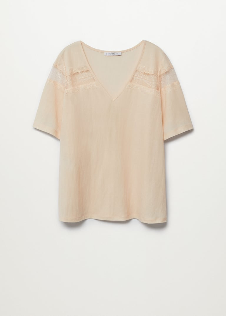 Tricou cu detaliu de dantelă. Țesătură vaporoasă, aplicație din dantelă. Guler în V. Mâneci scurte. Șlițuri laterale.